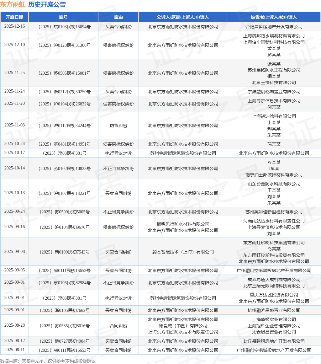 证券之星消息,根据天眼查APP显示,近日公布了一则北京东方雨虹防水技术股份有限公司作为原告/上诉人的开庭公告,详细内容如下: